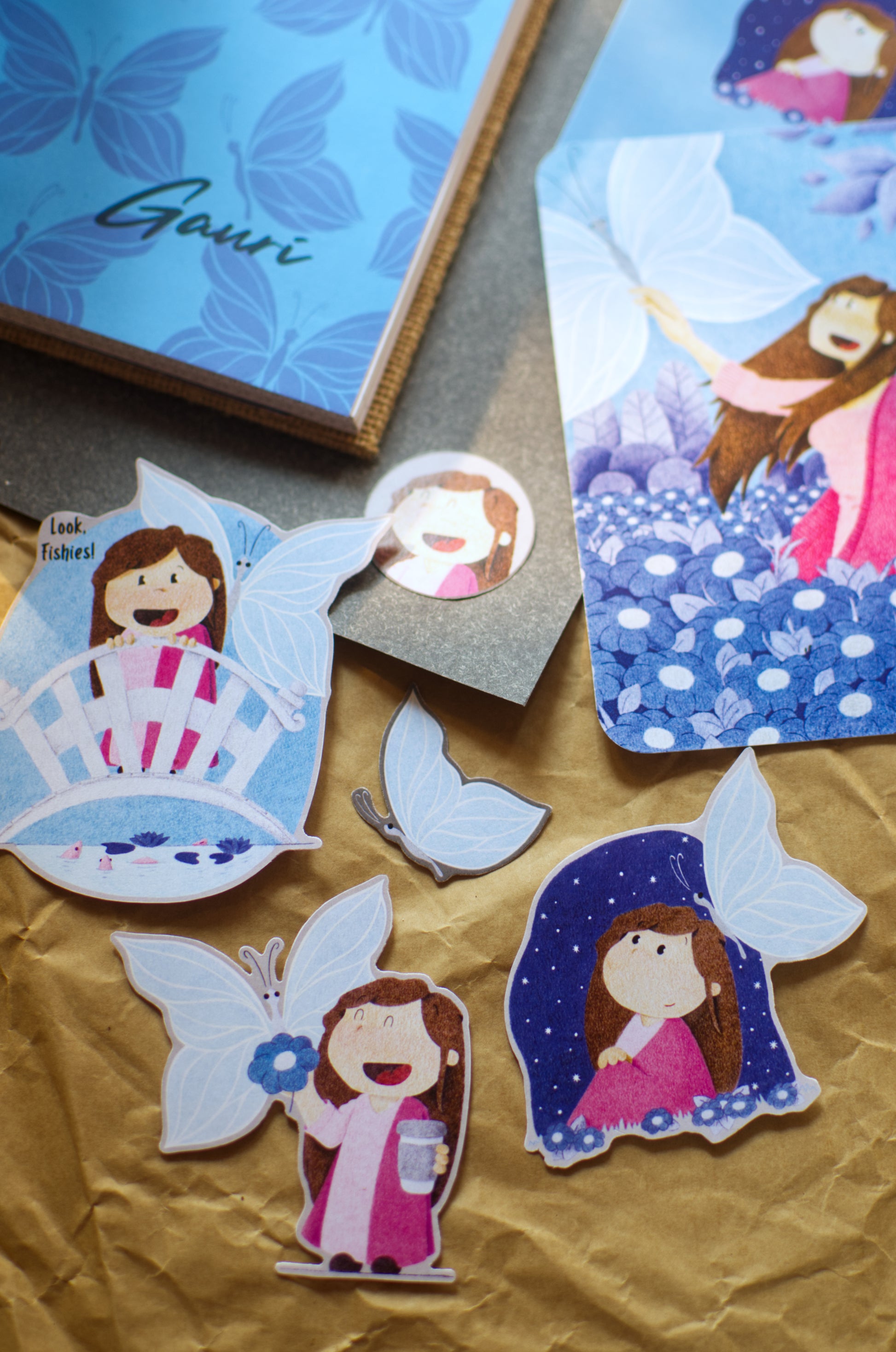 A journal made specially for you with your name, along with themed bookmark and some stickers. It makes a perfect gift as well!